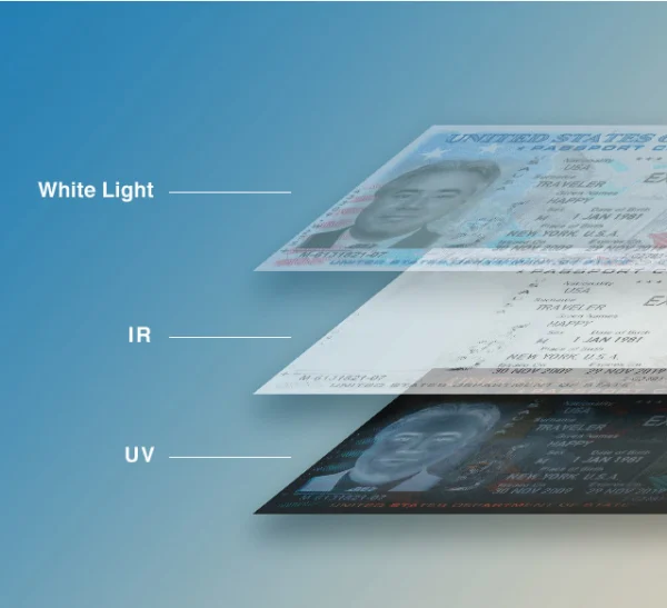 wavelength illuminations (Visible, IR and UV) to enable quick full page image capturing and accurate MRZ reading.